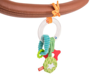 Игрушка совмещает в себе погремушку и подвеску с развивающими элементами. Перебирая и изучая эти элементы, малыш будет развивать свои тактильные ощущения, двигательную и слуховую активность.